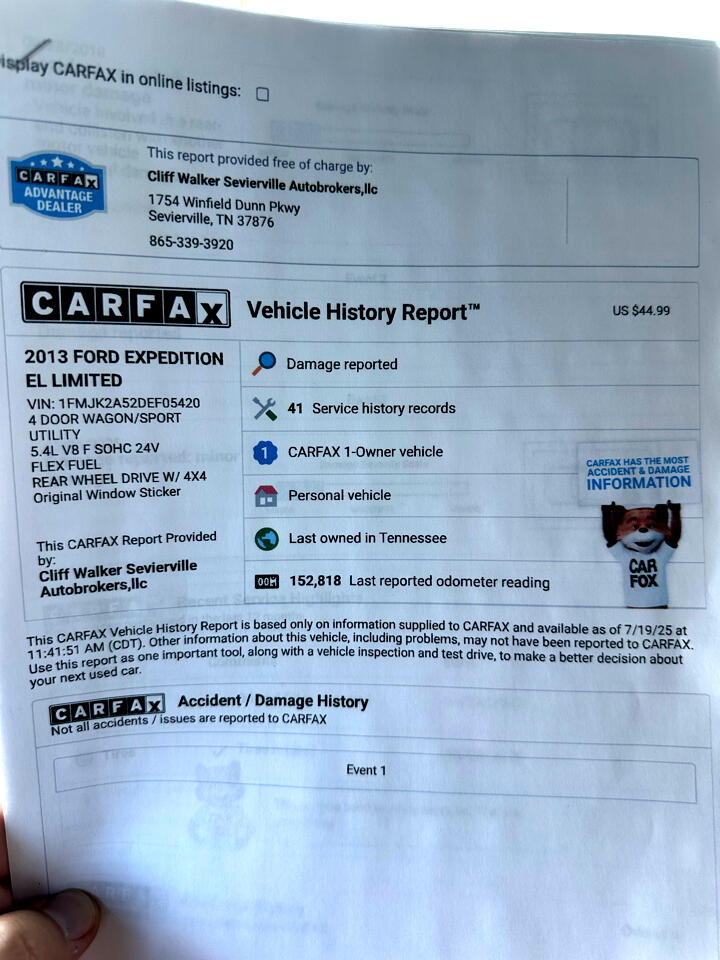 # 2013 Ford Expedition EL Limited 4x4 for Sale in Sevierville, TN - One-Owner CARFAX Certified Used SUV Are you searching for a reliable **used 2013 Ford Expedition EL Limited 4x4** in Sevierville, TN? Look no further! At Sevierville Autobrokers, we're excited to offer this spacious, family-friendly SUV that's perfect for road trips, daily commutes, and everything in between. With its powerful 4x4 capabilities, this **Ford Expedition EL Limited** is built to handle Tennessee's diverse terrain, from city streets to mountain trails. ### Key Features of This 2013 Ford Expedition EL Limited 4x4: - **One-Owner Vehicle**: Meticulously maintained by a single owner, ensuring top-notch care and history. - **CARFAX Certified**: Clean title with no accidents reported – peace of mind for your next **used SUV purchase**. - **3rd Row Seating**: Comfortably seats up to 8 passengers, with ample room for adults, kids, and all their gear. - **Spacious Cargo Area**: Plenty of space for luggage, sports equipment, groceries, or whatever your adventures require. No more cramped rides! - **Low Mileage for the Year**: Only 152,000 miles – well below average for a 2013 model, meaning years of reliable service ahead. - **Luxury Amenities**: Enjoy premium leather seats, advanced audio system, navigation, heated/cooled seats, and more for a first-class driving experience. - **4x4 Drivetrain**: Conquer off-road paths or snowy conditions with ease in this robust **full-size SUV**. Priced at just **$15,000**, this **2013 Ford Expedition EL Limited 4x4** is an unbeatable deal on a high-quality **used Ford SUV** in Sevierville. Whether you're a growing family, an outdoor enthusiast, or someone who needs extra space without sacrificing style, this vehicle checks all the boxes. ### Why Buy from Sevierville Autobrokers? As your trusted **used car dealer in Sevierville, TN**, we specialize in **CARFAX certified vehicles** like this **Ford Expedition for sale**. Our inventory includes a wide selection of **used SUVs, trucks, and cars** with transparent pricing and no hidden fees. Powered by DealerCarSearch, our website makes it easy to browse, compare, and finance your next vehicle online. Ready to take this **2013 Ford Expedition EL Limited 4x4** for a test drive? Visit us at Sevierville Autobrokers or explore more details on our DealerCarSearch-powered website: www.SEVIERVILLEAUTO.com Call us today at 865-774-886 to schedule an appointment or inquire about financing options. Don't miss out on this exceptional **used 2013 Ford Expedition** – contact Sevierville Autobrokers now and drive home in style!